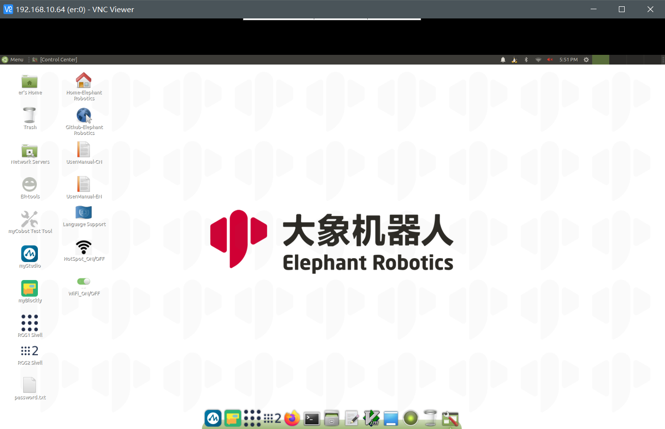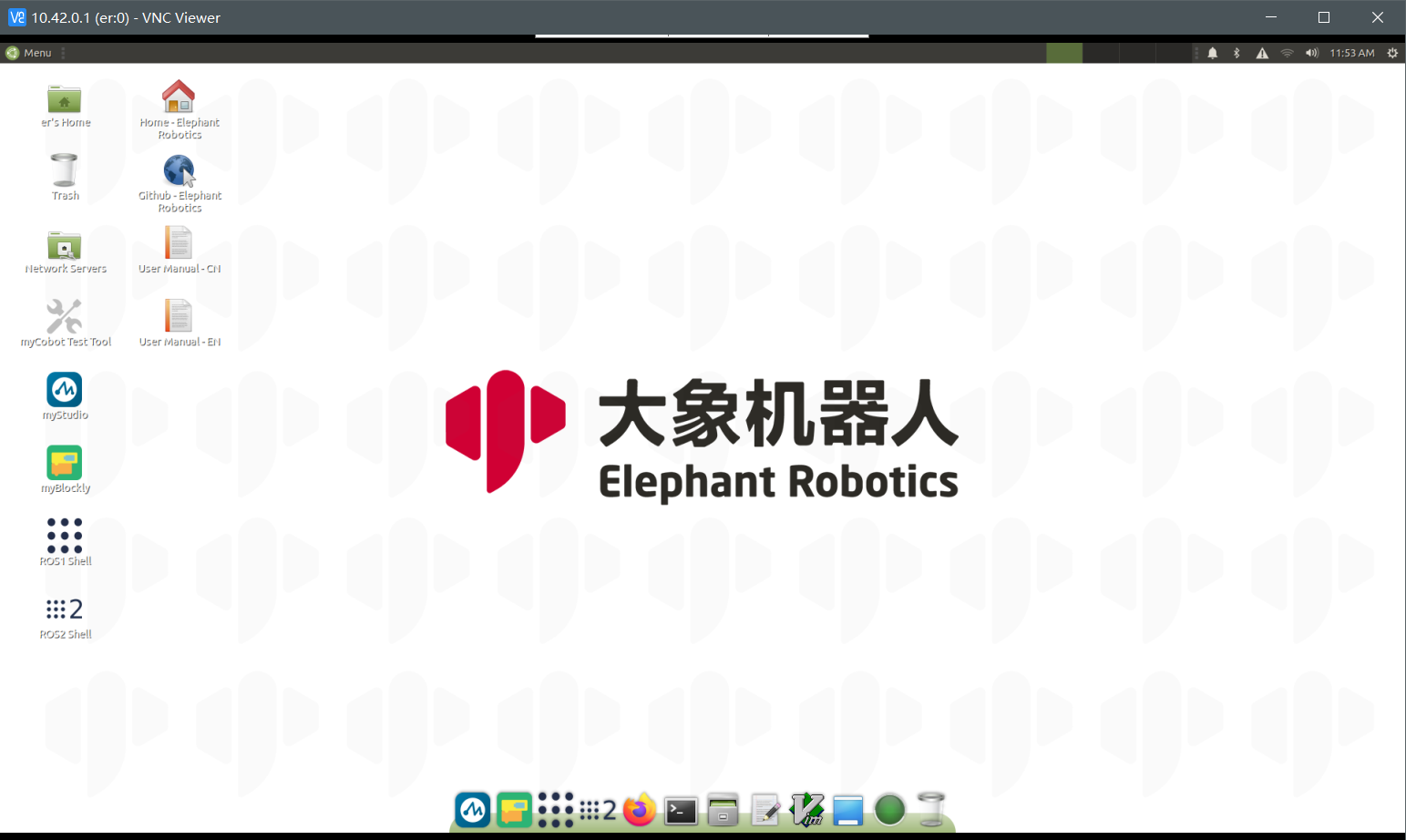 将您的电脑和机械臂的 WiFi 连接到同一个 WiFi 下,打开 VNC viewer 软件,输入这个 IP 地址(以上方的案例举例则为输入 192.168.10.64 )然后回车,密码是 Elephant,用户名默认是不填的,成功连接示例如下: