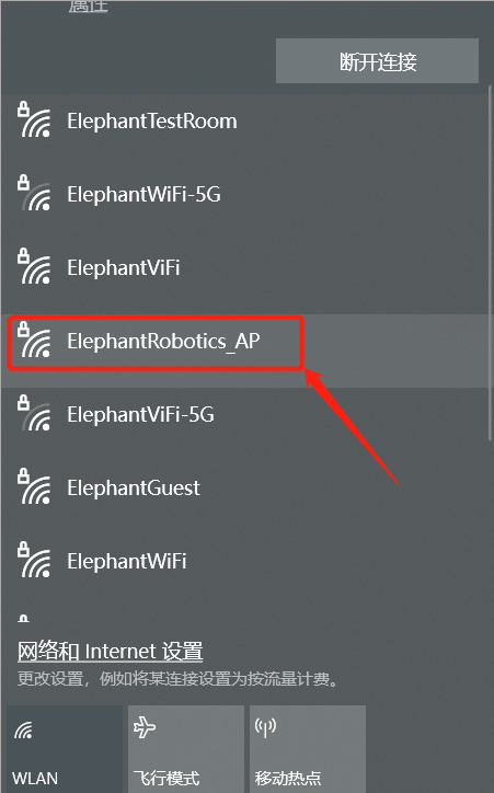 机械臂打开后,默认连接到系统配置的热点:ElephantRobotics_AP_XXXX